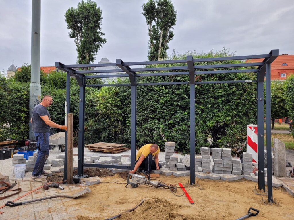 Projekt budowlany obejmuje wykonanie fundamentów punktowych lub prefabrykowanych podstaw umożliwiających szybki montaż wiaty w przestrzeni miejskiej. Odpowiednie zakotwienie konstrukcji zapewnia stabilność i bezpieczeństwo.